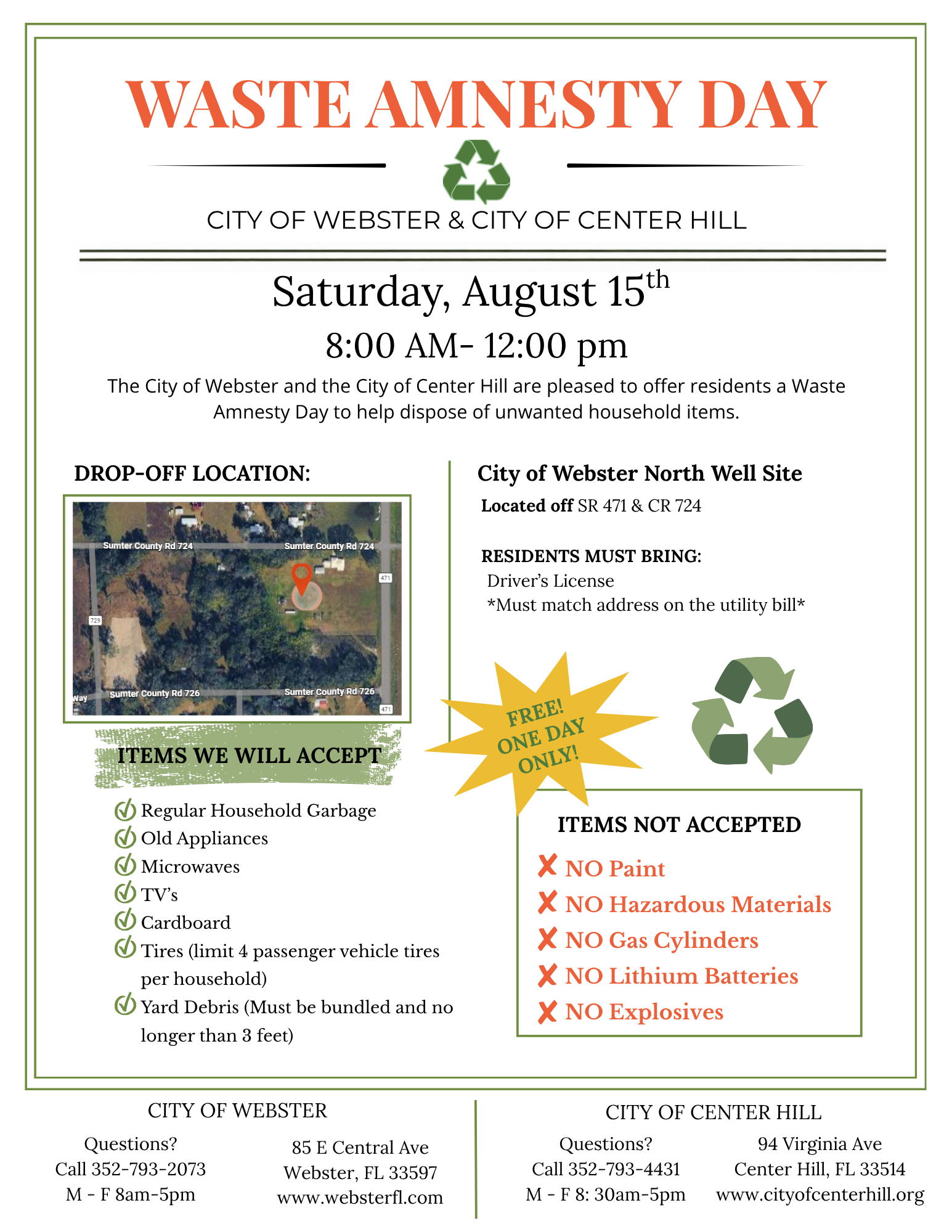 Waste Amnesty Day – Saturday, August 15 The City of Webster and City of Center Hill invite residents to take part in Waste Amnesty Day on Saturday, August 15, from 8:00 AM to 12:00 PM at the City of Webster North Well Site (off SR 471 & CR 724). This free, one-day cleanup event allows residents to dispose of approved household items including regular household garbage, appliances, cardboard, yard debris, TVs, microwaves, and up to four passenger vehicle tires per household. Please bring a driver’s license matching the address on your utility bill. Hazardous materials, paint, gas cylinders, lithium batteries, and explosives will not be accepted. For questions, contact City Hall at 352-793-2073.
